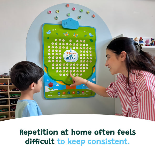 The 99 Names of Allah Interactive Mat & Wall Art combines learning, remembrance, and play in one meaningful experience. Each Name reveals its correct pronunciation, meaning, and short story, making it easier for children to understand and remember who Allah is.