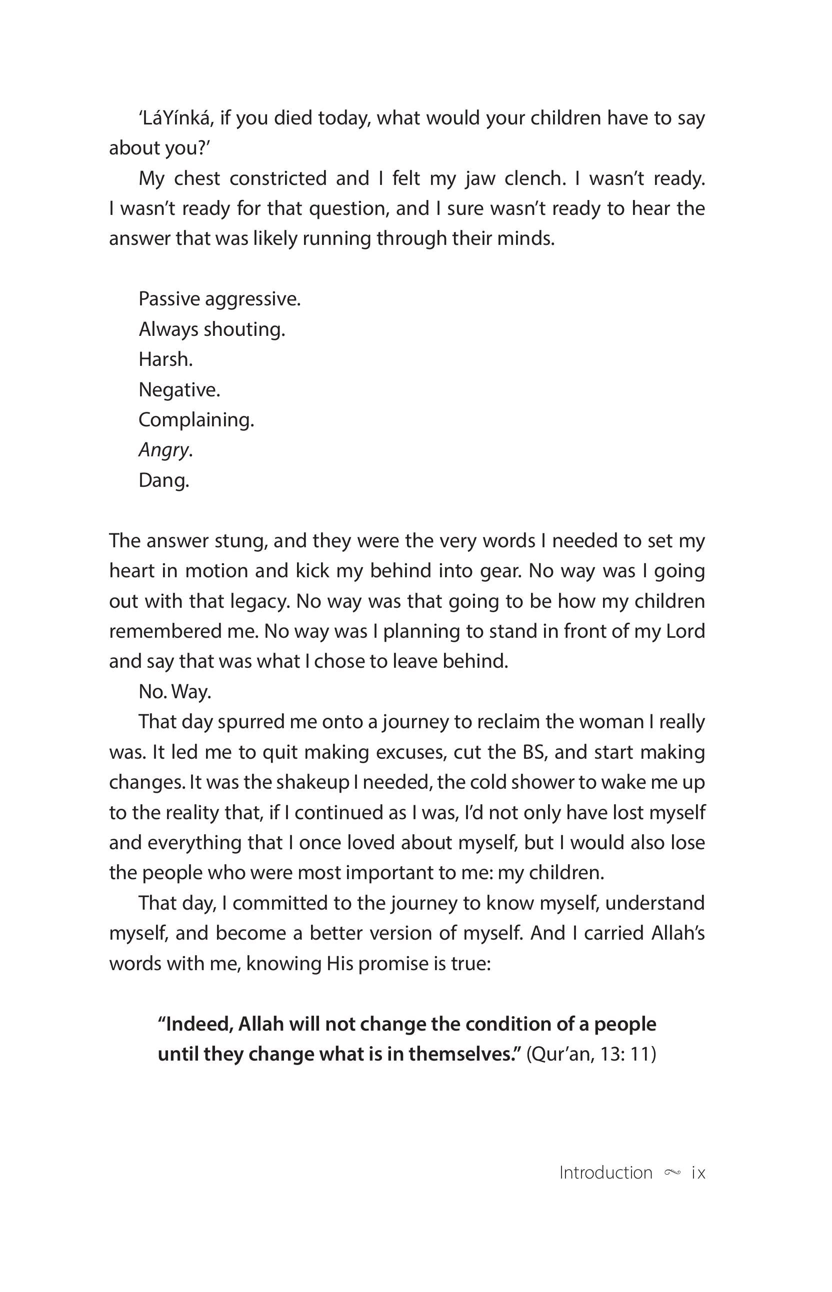 Honest, tender and wise, A Beautiful Homecoming is a self-help book for every Muslim woman who has become buried beneath her labels — mother, wife, daughter, sister, friend, employee — and who wants to reconnect with who she is and finally embrace all parts of herself. Drawing on her work as a transformation coach, her own personal experiences and her faith, LáYínká Sánní offers a powerful love letter from one striving woman to another, an invitation to step into a new internal reality, and a practical guide to transforming how you view both the world and yourself — forever.