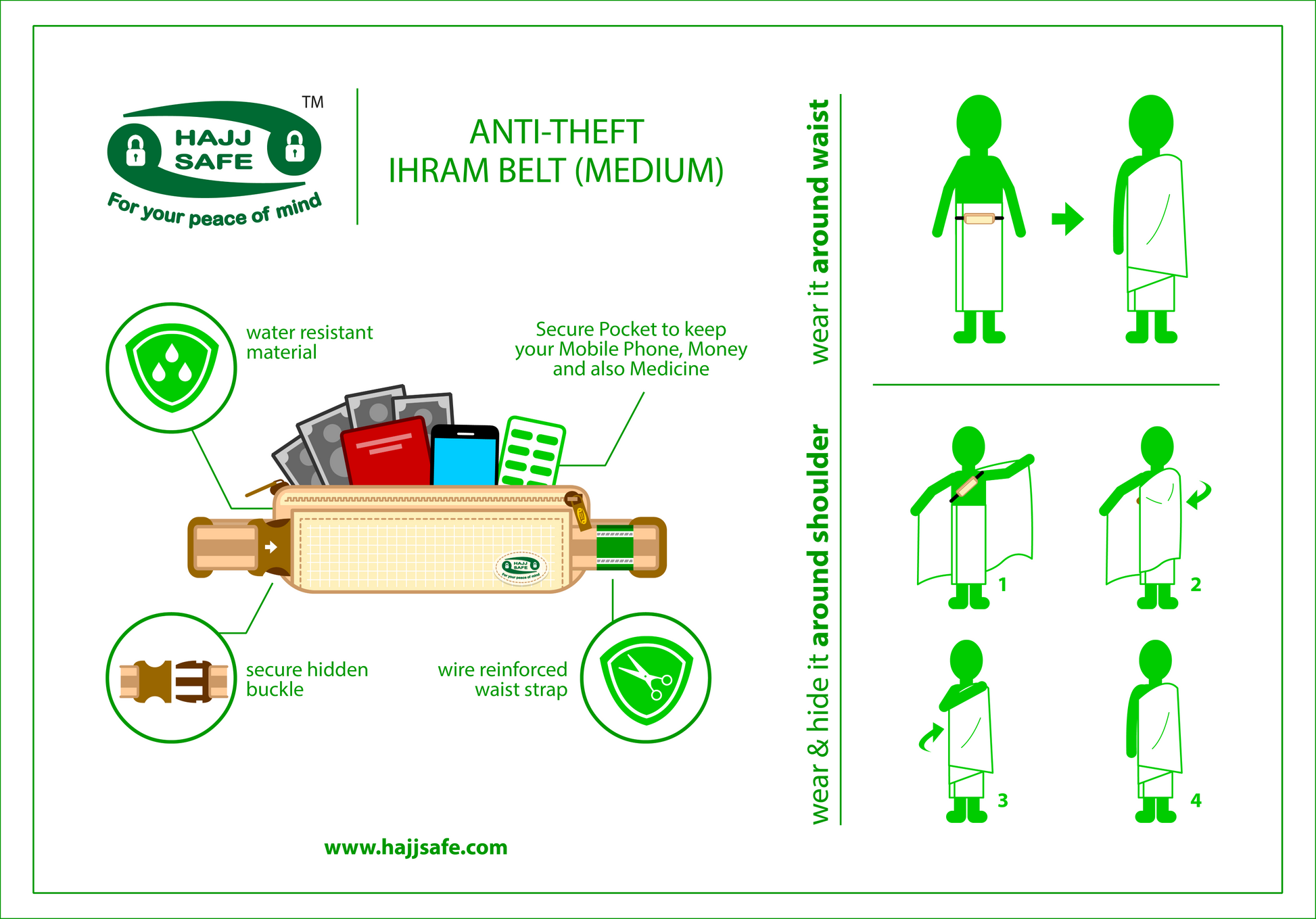 These bags can be worn around the waist or across the body. They are lightweight and discreet. It is easy to wear with Ihram and is discreet enough not to be seen or get in the way.