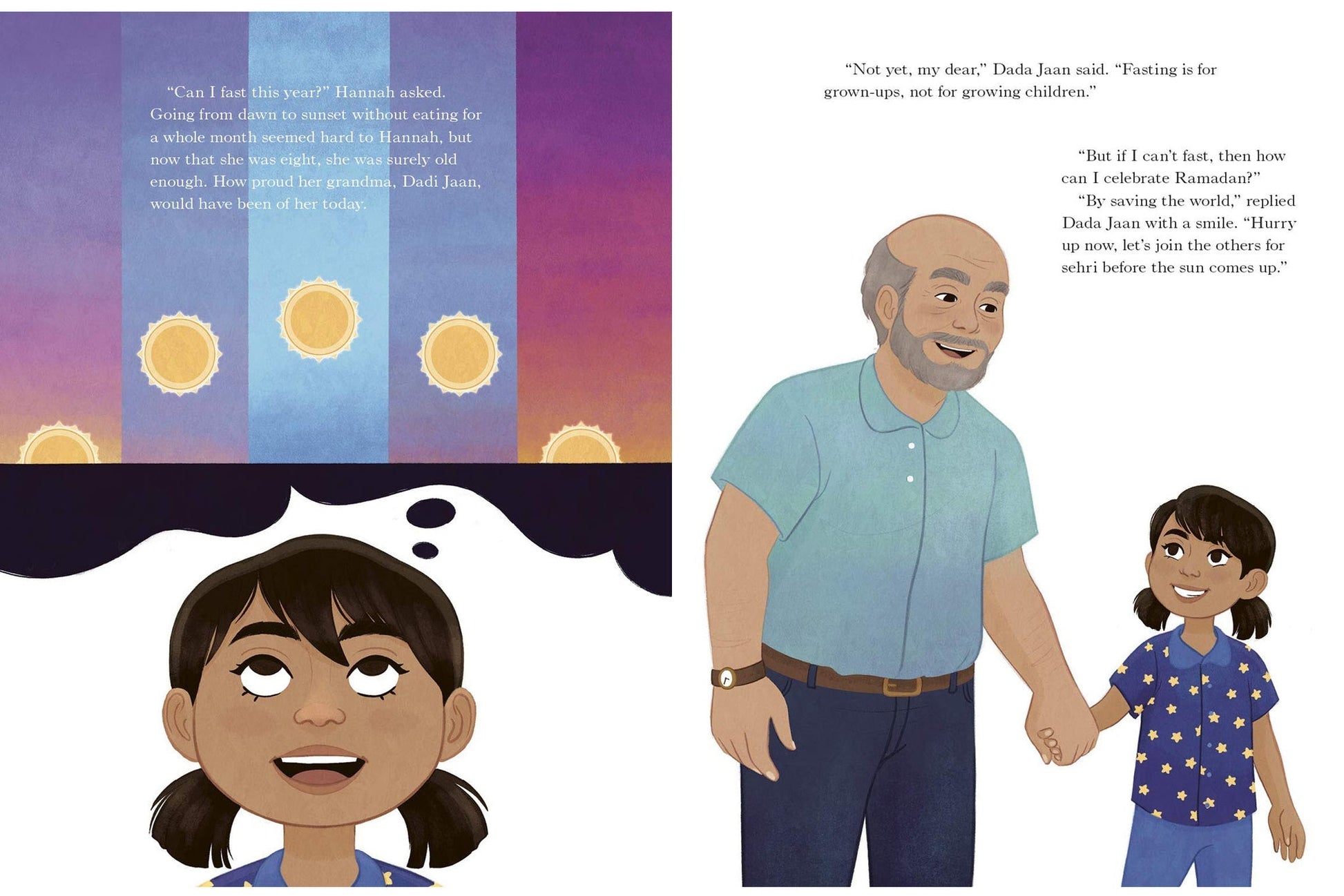 It's the first day of Ramadan and Hannah wants to be a part of this important month every way she can. But if she's too young to fast, how can she observe Ramadan? By saving the world, Dada Jaan tells her. And so Hannah learns that by helping her friends and neighbors and by showing kindness and generosity, she can make the world a better place.