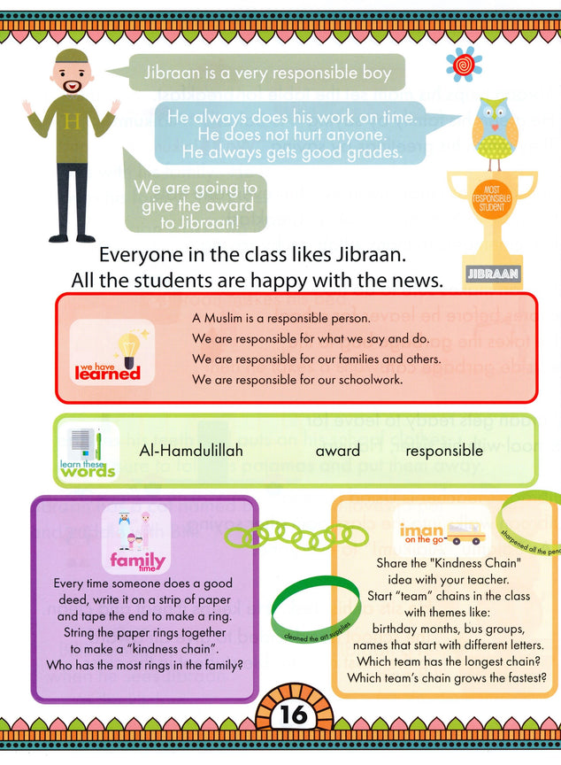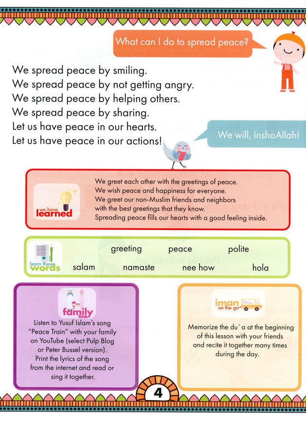 IQRA’ WISE (Weekend Islamic School Excellence) is a unique Islamic Studies series that offers 5 subjects in 1 book! This program takes a fresh approach to the Islamic curriculum in the elementary classroom. This second textbook of the series promotes critical thinking by using structured and engaging lessons and captivating graphics. Second graders will build on concepts from first grade, students are taught that a part of a Muslim’s identity is to always tell the truth, love Allah’s creations, and be responsible children. The textbook also emphasizes our duties to Allah including details on how to pray Salah and the five pillars of Islam. In second grade students are also able to learn the beautiful history of Prophets Ibrahim, Ishaq, Ya’qub, and Yusuf (A); with a continuation of the Sirah of Rasulullah (s). IQRA WISE navigates students through complex concepts by keeping content age-appropriate and following strict readability guidelines to ensure students are able to read and comprehend the text on their own. Continue the series and let your students fly in the skies with IQRA’ WISE!