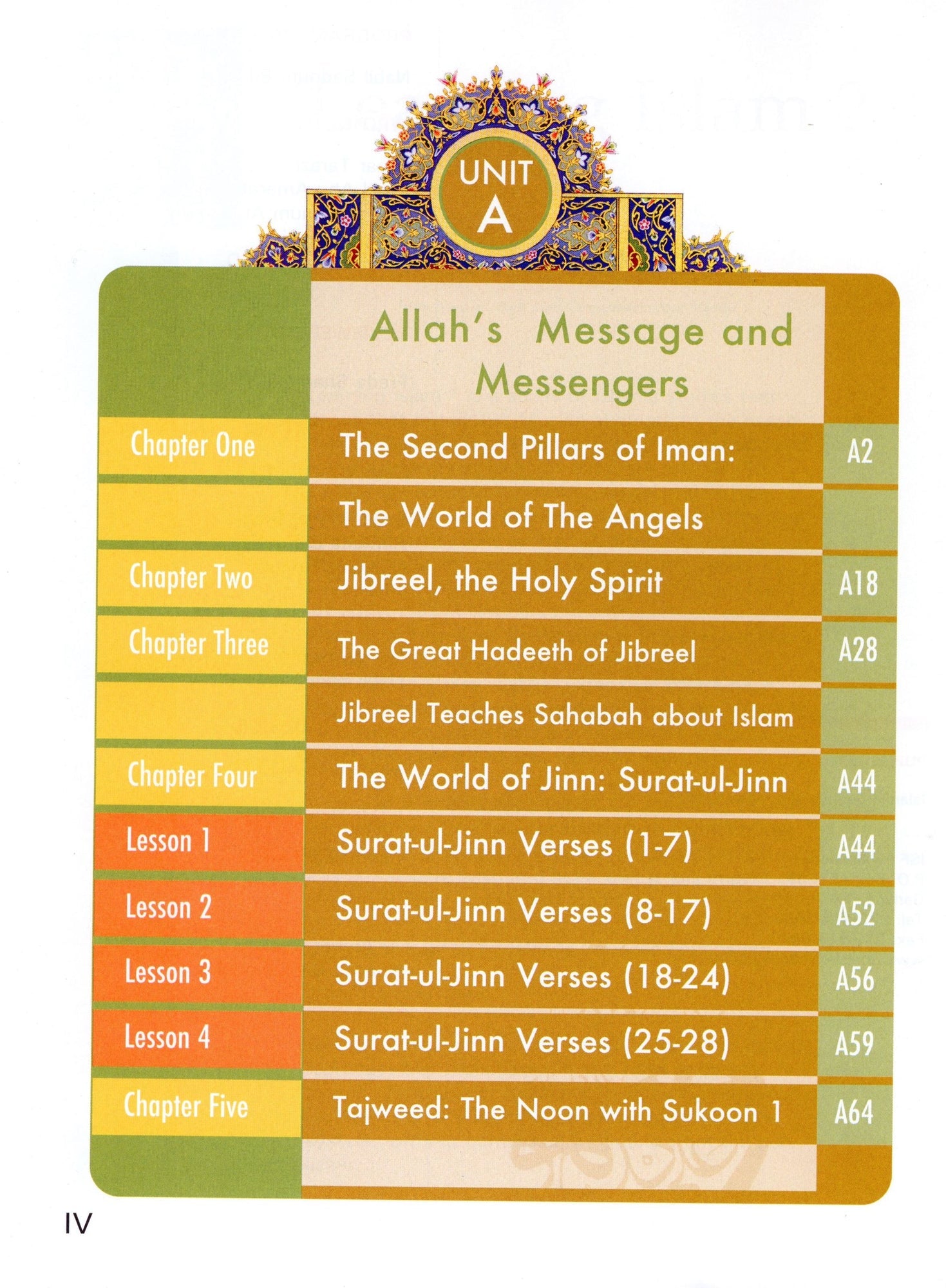 The units’ titles are: Allah’s Message and Messengers, Journey to the Hereafter, Islam Prevails over Arabia, Muslim Life Style and Zakah & Charity.