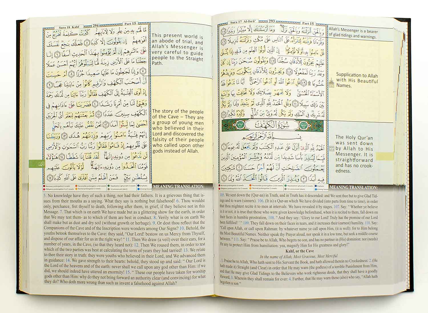 This Tajweed and Memorization Quran comes with a nice hard cover. Memorization of the Quran is facilitated here in a very creative way. On every page of this copy of the Tajweed Quran, subjects are distinguished by a different background color, with brief overviews of the subject in English added on the margin. This helps in understanding the sequence of the surah, and increases the awareness and the ability of linking the subjects to the texts for enhanced memorization.